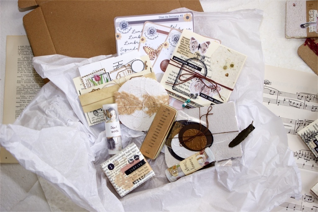 Essa caixinha média (tamanho interno 21x16x3) é montada especialmente para você, que gostaria que eu (Gabi) montasse um pacotinho com a minha cara e com vários ítens básicos ou não, que podemos usar em todo tipo de colagem ♥️