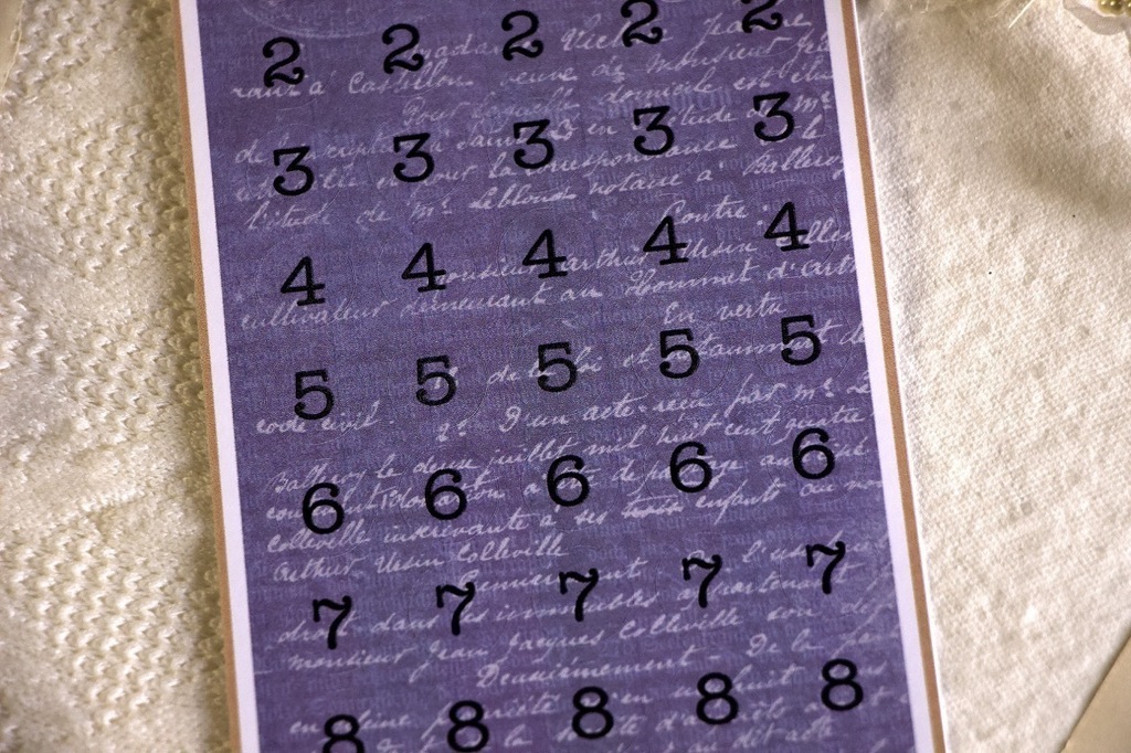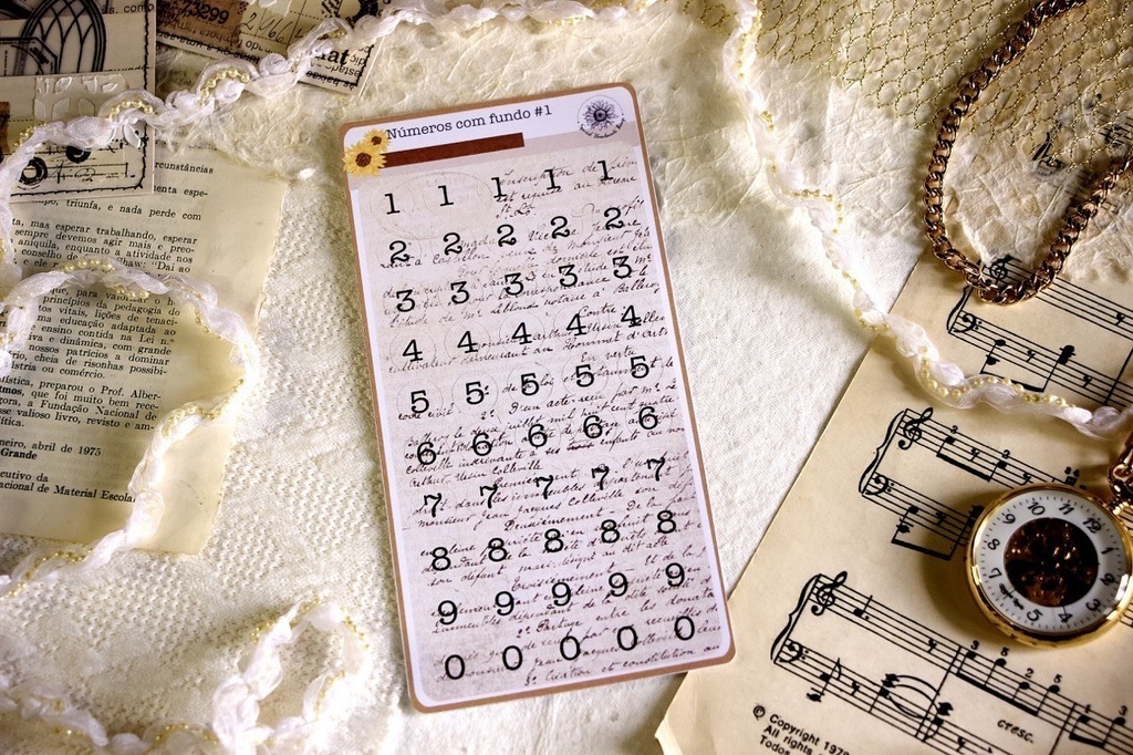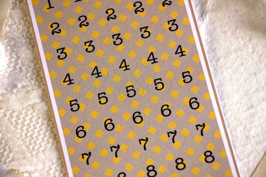 São cartelas com adesivos redondos de números (de 1 a 0) com fundos texturizados diferentes.