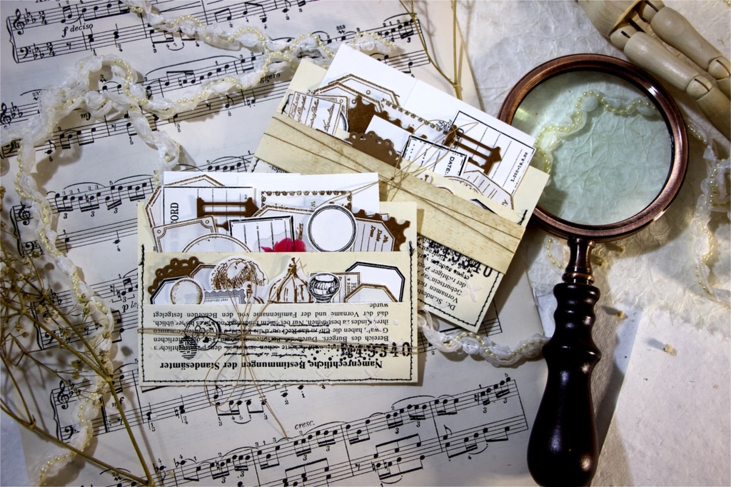 Mini pocket com várias carimbadas recortadas à mão, em tons neutros e die cuts!
