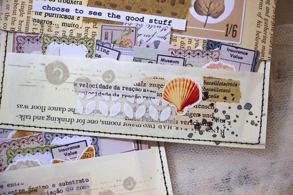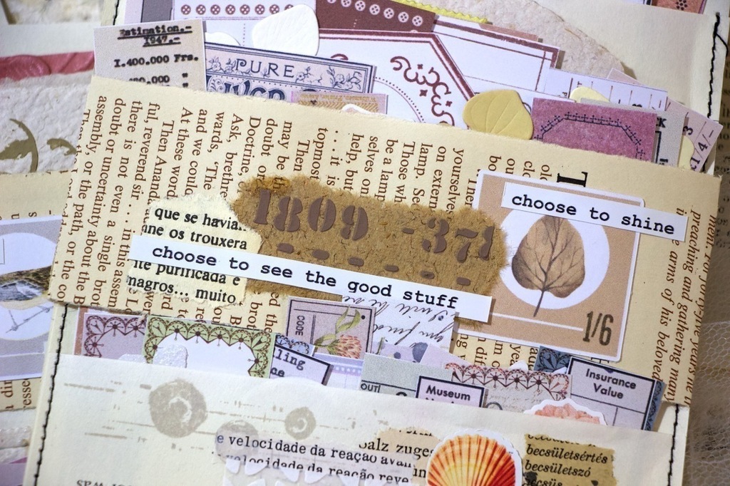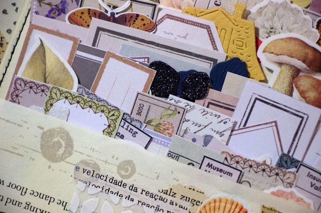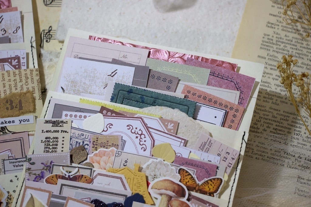 Contém tickets, tags, papel artesanal, papéis para colagem, folhas de livros, recortes de flores, pássaros, cogumelos, borboleta, die cuts e muito mais!!